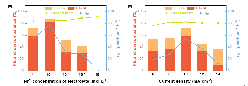 图5.电解液中Ni2+和Cu2+浓度和电流密度对2-甲基呋喃(MF)和糠醛(FA)产率和电流效率的影响