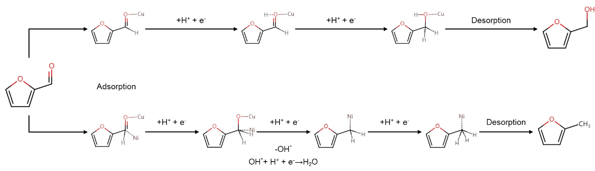以糠醛作为生物油模型组分,将电催化还原(ECR)技术应用于糠醛(FF)还原反应,以制备高产率2-甲基呋喃(MF)为目标,对电极结构和条件影响规律以及催化剂作用机制进行研究。以碳纸为基底材料,通过同步电沉积方法制备了NiCu/CP双金属双层电极。研究显示,该电极催化剂的核心催化剂为Cu,极少量Ni可对反应产生显著促进作用,最佳Ni/Cu配比为0.007。其作用机制与Ni、Cu双金属活性位点的排布及其协同催化过程有关。目标产物2-甲基呋喃的电流效率和产率随电解液pH值及工作电流升高呈先增加而后下降的变化趋势。电解液中存在微量Ni2+有利于促进2-甲基呋喃生成,Ni2+最佳浓度为10 -7 M,该浓度条件下,糠醇和2-甲基呋喃总电流效率(88%)、2-甲基呋喃电流效率(82%)和2-甲基呋喃产率(77 μmol∙cm-2∙h-1)达到本体系最佳值。催化剂失活后可通过再生处理恢复性能,实现循环利用。