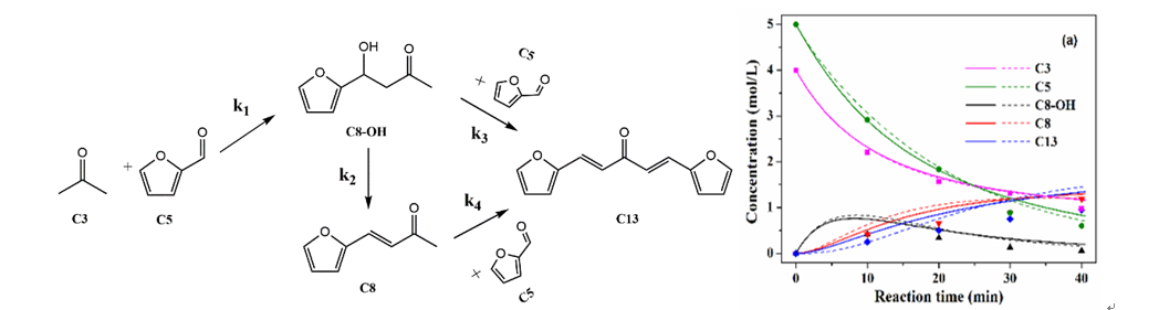 图7. NaHSO4/ZrO2/水-THF反应体系中纤维素制备HMF的反应示意图以及糠醛-丙酮缩合反应动力学模型70oC