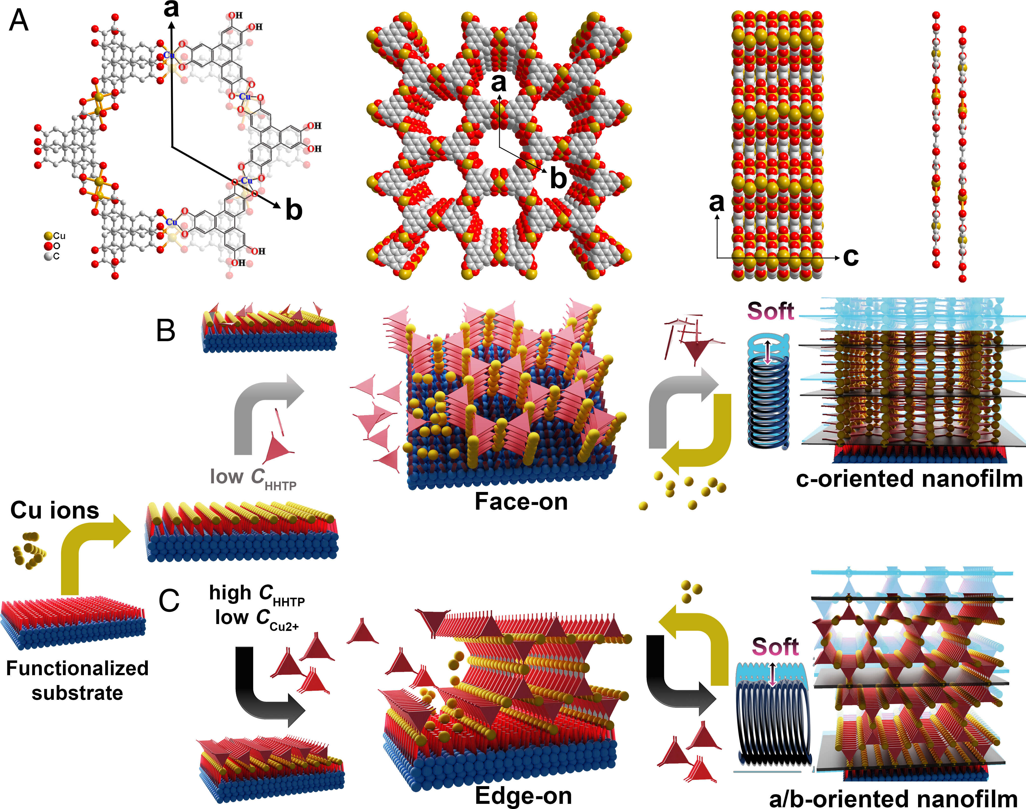 基于六羟基三亚苯(HHTP)配体的软孔晶态Cu-HHTP薄膜以其优越的电学性能与稳定性受到了广泛关注,然而在薄膜的可控制备、微纳尺度下的原位表征,及其导电机理探究方面仍存在挑战。理论计算表明,薄膜生长过程中“站立(edge-on)”起来的边取向或“躺平(face-on)”状态的面取向模式都会影响薄膜的性能,因此可通过调控SPCs晶体的取向来调控薄膜的性能。然而由于制备与表征的技术局限,该项工作始终无法实现。实验表明,Cu-HHTP薄膜合成过程中,HHTP配体在未完全配位时难以维持“站立”状态,从而导致难以成功制备边取向的薄膜。此外,科研人员观察到薄膜的导电率虽发生变化,却无电荷转移证据,对于这种反常现象无法探明机理。因此,推测SPCs在电荷转移型导电机理以外,还隐藏着新型导电调控机制未被发现和证实,需要进一步探究。