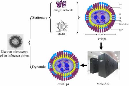 2009年,甲型流感席卷全球,其罪魁祸首是H1N1型流感病毒。基于实验所得流感病毒的概貌,以及其主要组分(多种蛋白质、RNP等)的单分子三维结构,可通过计算机从原子水平构建流感病毒的整体结构,并采用基于GPU的动力学模拟程序计算其在生理环境下的演变。该模拟首次从原子水平复现病毒颗粒的三维动态结构,可用于流感病毒致病机理的深入分析,并进一步用于新型抗流感病毒的研制(文章链接 Ji Xu, Xiaowei Wang, Xianfeng He, Ying Ren, Wei Ge, Jinghai Li. Application of the Mole-8.5 supercomputer -- Probing the whole influenza virion at the atomic level. Chinese Science Bulletin, 2011, in press.)。