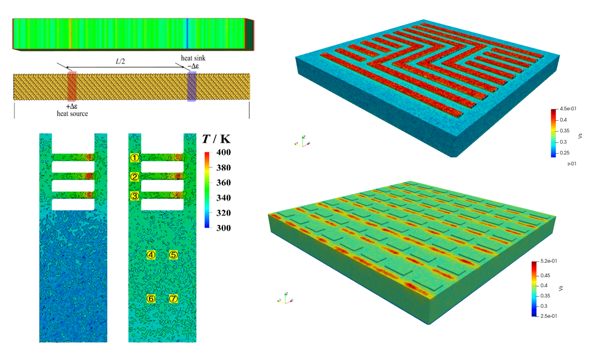 研究团队创建了大规模高性能原子模拟方法,取得了巨大的性能加速,支持千万计算核心的高效并行计算,模拟原子数目超过万亿[1,2,4,6]。克服了纳微结构热力学性质非平衡分子动力学模拟的有限尺寸效应,揭示了纳微尺度声子传递机制,建立了介尺度导热模型[3,7,8]。以此建立了集成诸多纳微因素的芯片电路热模拟技术[5],形成了自主大规模高性能软件,在多台全球第一中国超算系统实现了全机规模应用,为芯片热管理设计提供了有力手段。