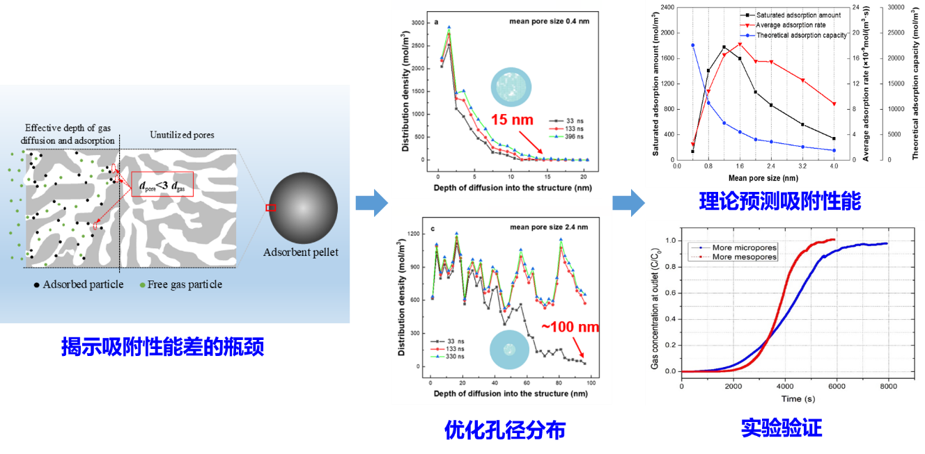 采用自主开发的硬球-拟颗粒(HS-PPM)耦合方法,针对吸附剂的吸附速率与容量难以兼顾的难题,模拟了孔道内吸附-扩散耦合过程,揭示吸附性能瓶颈,并建立多组分扩散系数预测模型。通过精准调控孔径分布,实现了吸附速率与容量的协同提升,并通过实验验证了该优化效果,模拟方法可进一步推广至催化反应等相关系统的优化设计中。
