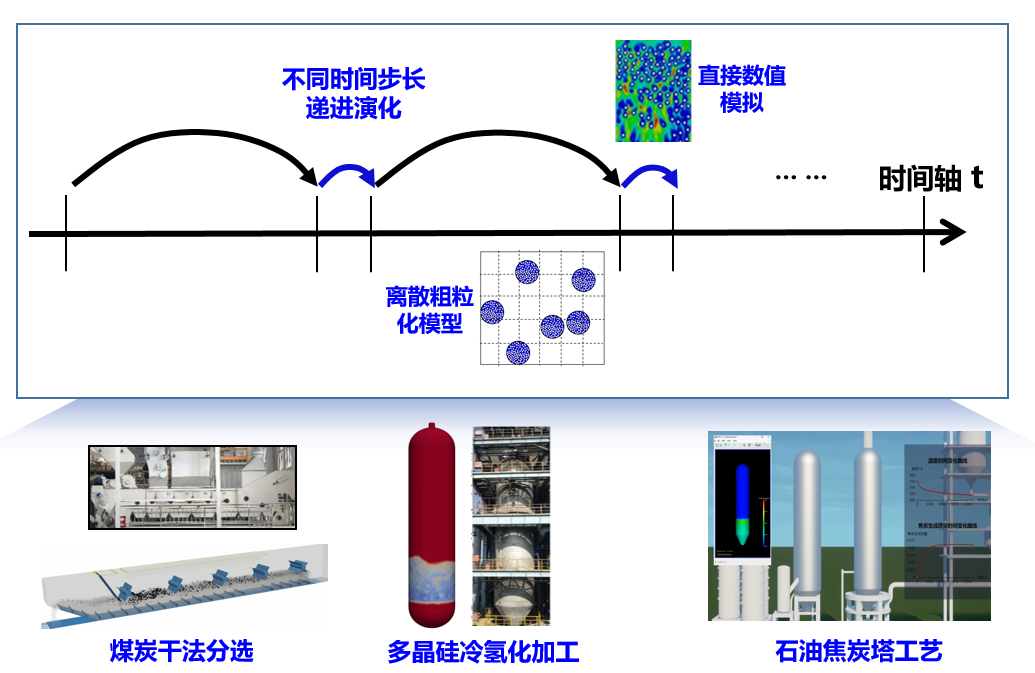 颗粒-流体系统中微尺度到宏尺度存在明显的时空间隔,时间多尺度动态模拟方法基于介尺度结构动态演化机制,采用多时间步长递进演化,耦合直接数值模拟、粗粒化模型、稳态模型等不同方法在精度、速度的优势,可以实现工业装备长时间、大规模高效计算,并在煤炭分选、多晶硅冷氢化加工、石油焦化等过程应用。