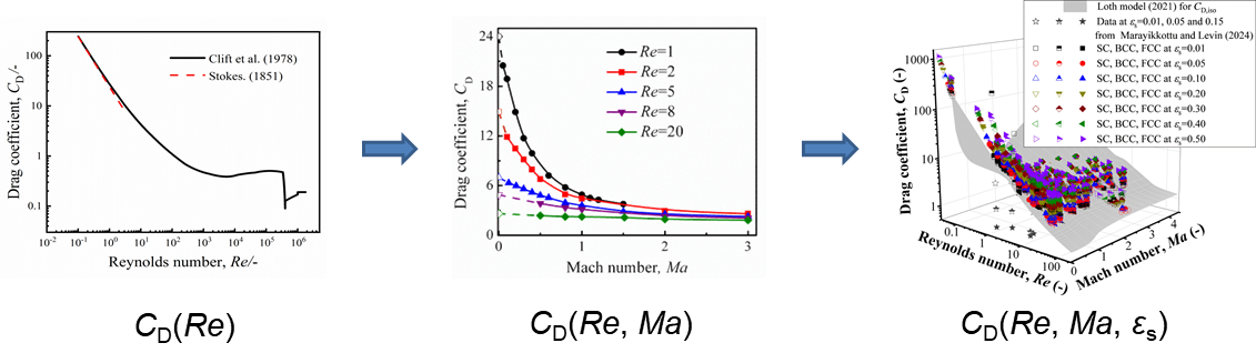 曳力系数(CD)是颗粒-流体系统的重要基本参数。采用结合时间驱动算法与硬球模型的拟颗粒模拟方法(PPM),研究了1≤Re≤20和0.1≤Ma≤3条件下孤立颗粒及颗粒阵列的绕流问题,分析了曳力系数与雷诺数(Re)、马赫数(Ma)及固相体积分数(εs)之间的关系。研究表明:1)曳力系数随Re和Ma的增大而减小,其关系式为CD (Re,Ma)= CD (Re)[aexp(-bMa)+(1-a)],其中CD(Re)为不可压缩流中孤立颗粒的标准阻力系数,系数a、b与Re相关;2)曳力系数随εs增大而增大,其关系式为CD (Re,Ma,εs)= CD (Re,Ma)(1+Kεsn),系数K、n与Re和Ma相关。本研究填补了滑移流与过渡流区域内多颗粒曳力数据的空白,为广泛存在的颗粒-流体系统提供了曳力定律。