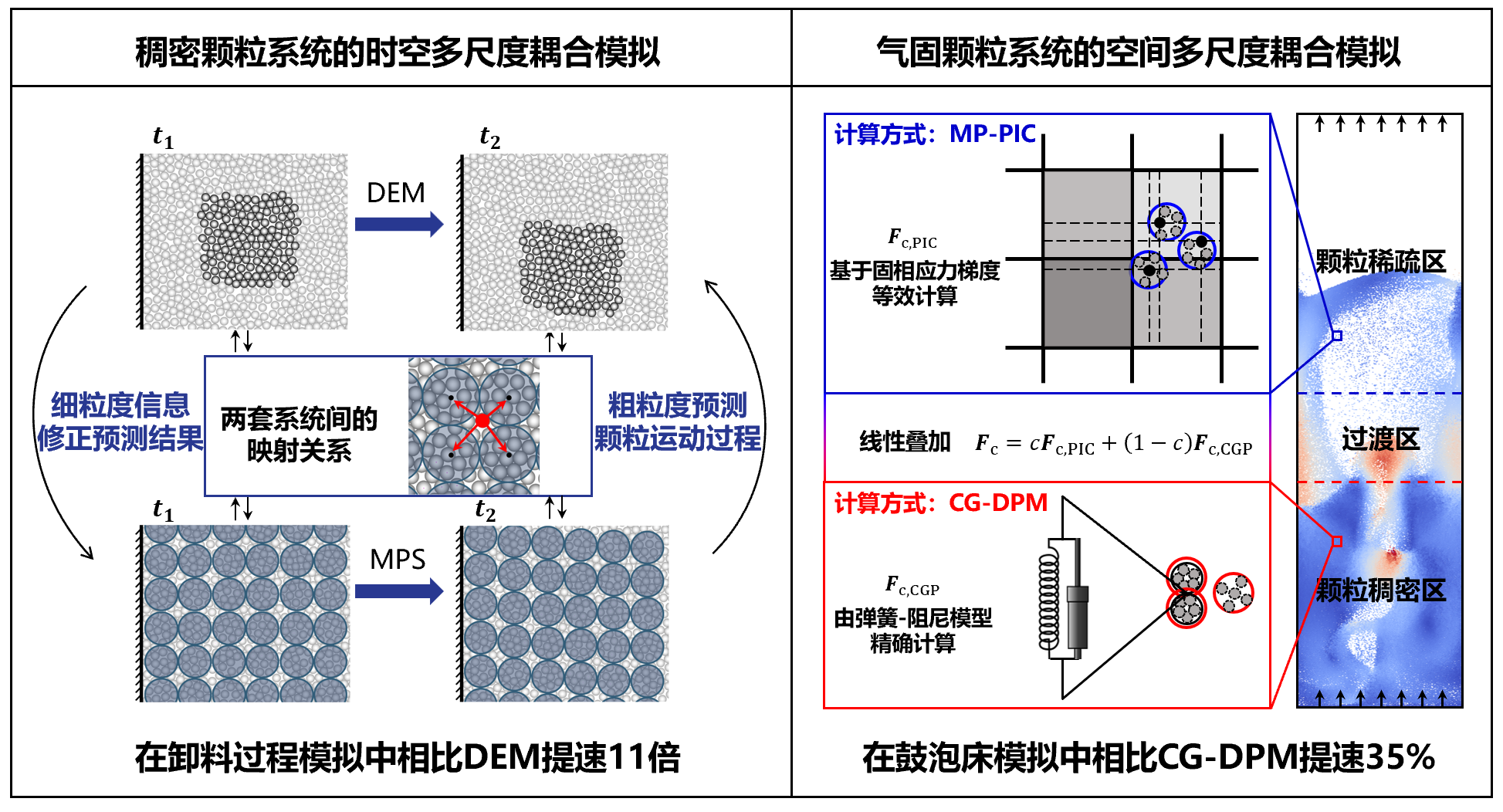 针对稠密颗粒系统,将具有精度优势的离散元方法与具有速度优势的连续介质方法在时间尺度耦合,在提高模拟结果空间分辨率的同时,相比离散元提速11倍。针对气固颗粒系统,基于计算域稀密相分解,将精确解析颗粒接触的离散颗粒模型与简化处理碰撞的多相质点网格法耦合,在鼓泡床模拟中提速35%。