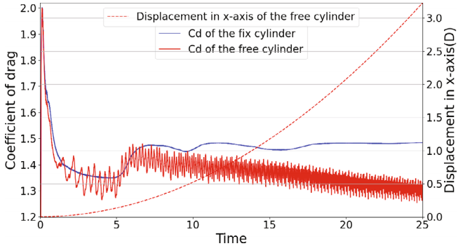 图1 固定颗粒(蓝线)和自由运动颗粒(红线)的曳力系数,以及自由颗粒在x方向的位移(红虚线)随时间的变化。