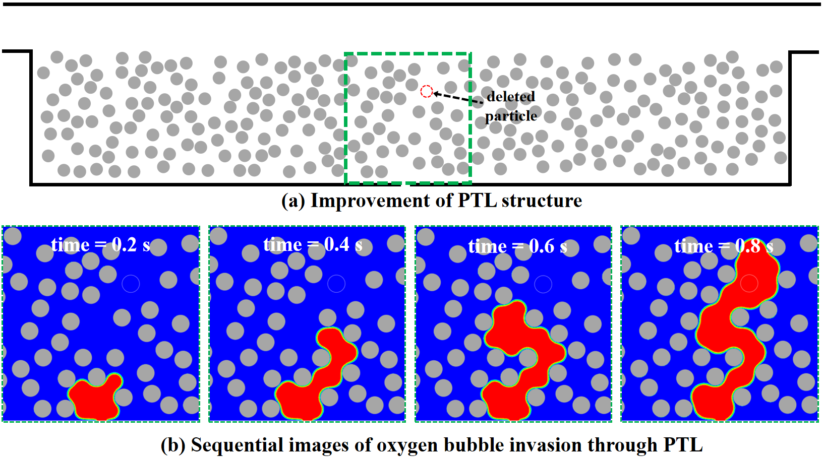气泡覆盖现象会阻碍反应物水到达催化剂表面,同时覆盖催化剂活性位点,阻碍热量传递,从而降低电解效率。许多实验研究了PTL微观结构对气泡移除过程的影响,然而实验研究存在无法可视化PTL中气液传输或者需要使用昂贵的非侵入性实验技术等局限性。相比之下,模拟方法无需昂贵的非侵入性技术,可以作为研究PTL内气液流动的有效方法。本课题组发表了一篇综述文献(DOI:10.1016/j.coche.2023.100988),概述了当前对PEMWE中多相流的认识以及相关的建模方法,并强调了调控PTL微观结构的重要性。此外,本课题组还开发了一个耦合电化学、两相流动力学和离子传输的多物理模型(DOI:10.1002/aic.18223),用于研究高电流密度下PEM电解槽内的多相流动以及响应时间特性,并从多相流动的角度解释了高电流密度下性能恶化的原因。最近,本课题组在多孔传输层的气液流动方面进行了微观模拟研究,文章亮点如下。