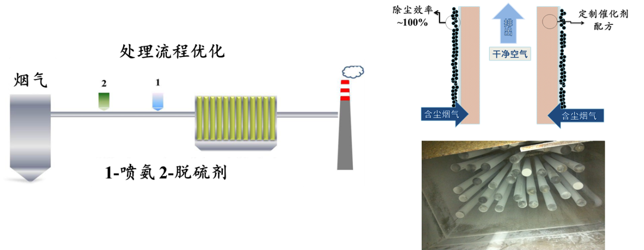 开发了孔隙率可调、压降小、轻质高强的纤维陶瓷膜,已经实现规模化的生产,该纤维陶瓷膜可以高效去除高温烟气的颗粒物。基于纤维陶瓷膜轻质高强、孔隙率低的优点,通过催化剂组分调控、催化-膜界面设计、催化剂负载工艺等技术手段得到了除尘效率高、催化效果好、气阻低的除尘催化耦合模块。在具体应用中,根据工况不同,该耦合模块可以实现定制化设计制备,满足不同行业废气的针对性处理。此外,通过外场强化技术,可以进一步提高除尘和催化的效率。