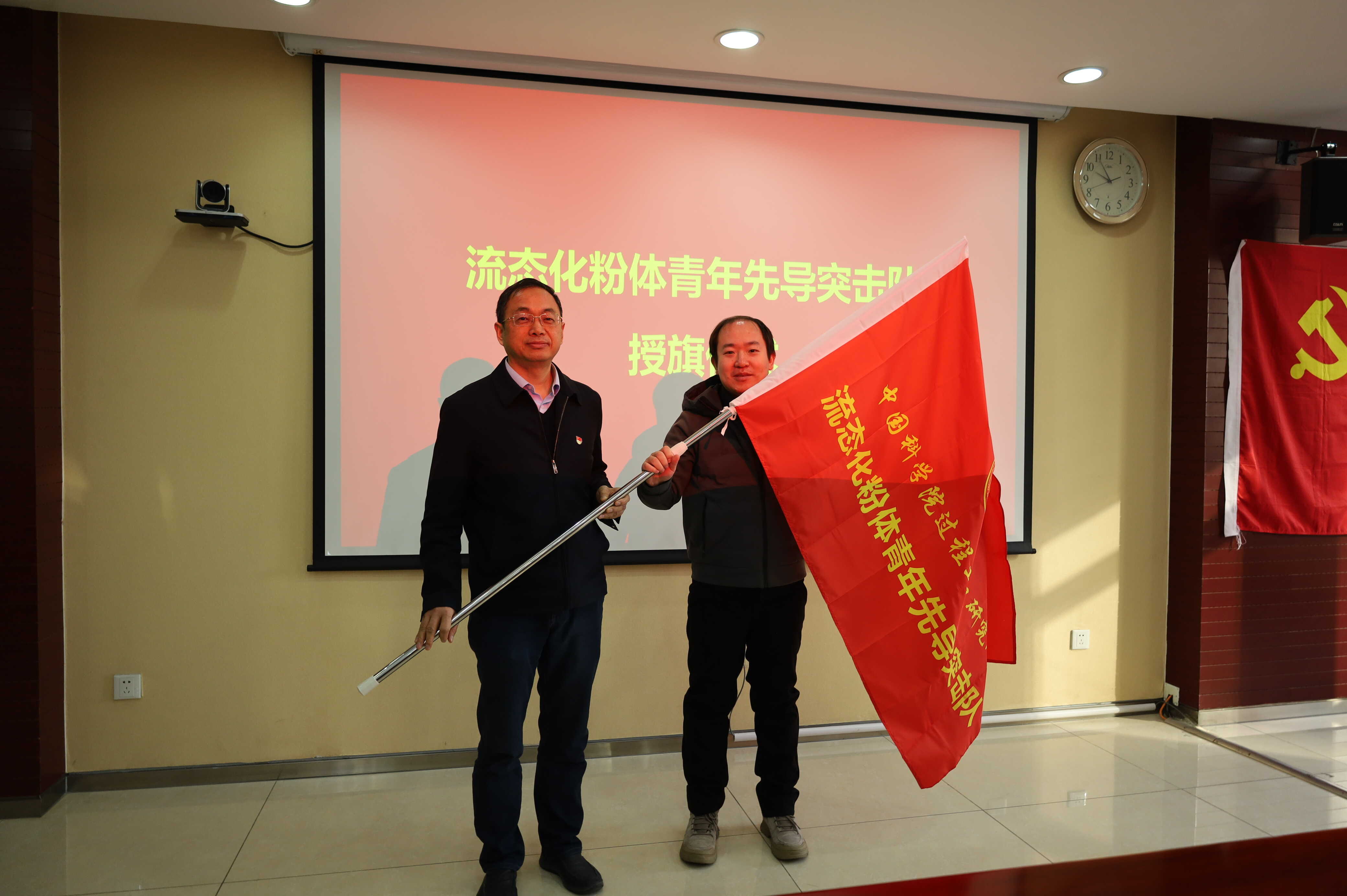 交流会由所党委书记朱庆山主持,双方重点介绍了党总支及党支部的组织架构、组建历程、创新特色及合作情况。基于双方在粉体关键材料等方面的紧密合作,为进一步发挥党员在关键任务中冲在前、干在先,联合攻关的表率作用,介科学全重党总支向所党委申请成立“流态化粉体青年先导突击队”。会上,朱庆山代表所党委向突击队队长郭强授旗。